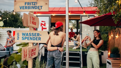 In-Kontakt-Kommen. Mit dem ikonischen FRITZ!Box-Tiny House als Zentrum lud das Setup zu kreativen Aktionen, spontanen Begegnungen und musikalischen Highlights ein.